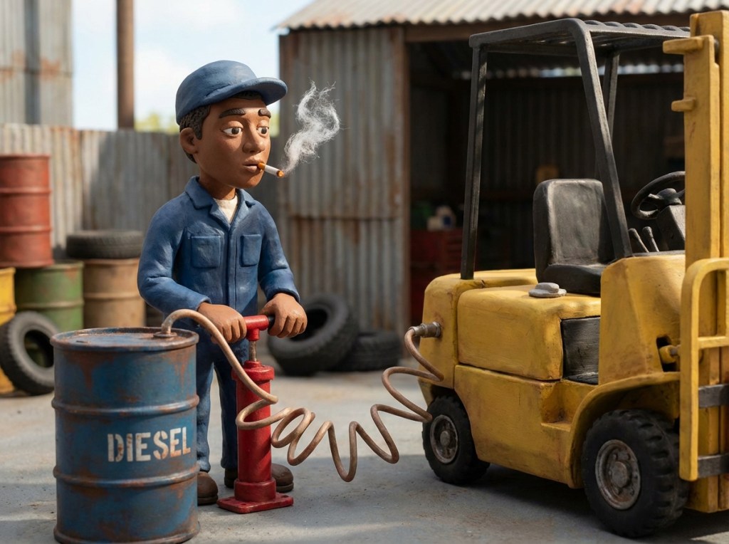 Those forklifts were diesel too. I remember my cousin showing me how to fill them up from the barrel with a rotating hand pump; a cigarette hanging from his mouth the whole time.