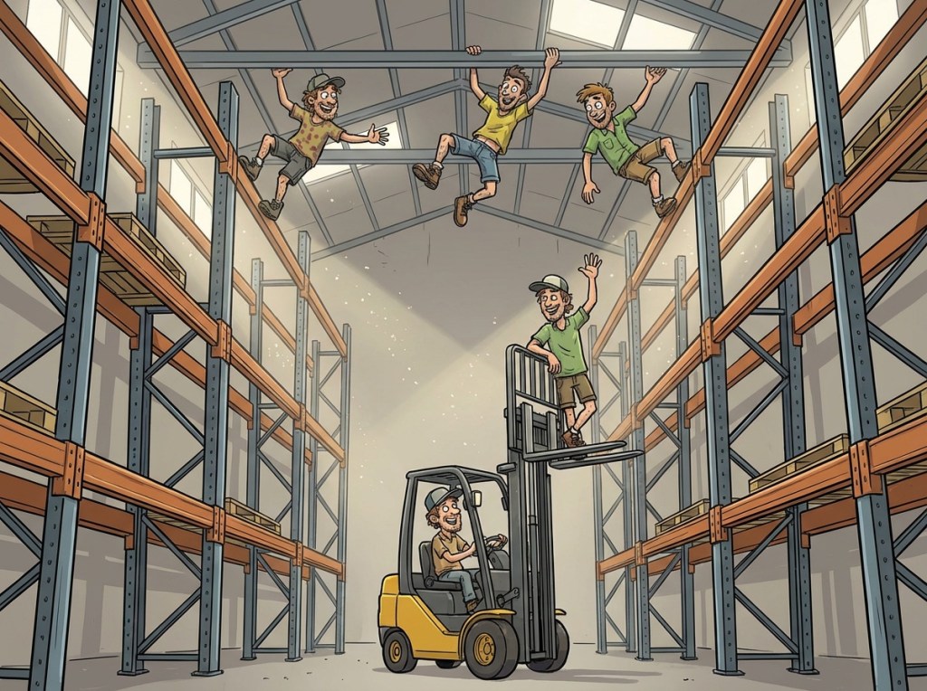 So here we all are getting hoisted up via forklift and traipsing around on the horizontal beams anywhere from 6ft up to two storeys high. Safety cage? You must be kidding. You don’t even get a pallet buddy; just stand on the tines and shut up.