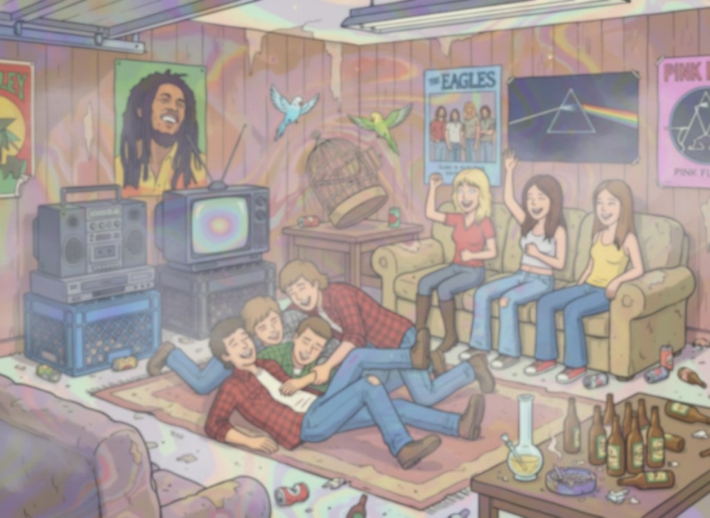 We were all laughing and goofing off; just enjoying the mind bending effects of the acid. I don’t know exactly how it started, but I can recall Danny standing in front of me as I sat on the couch. I think we were exchanging friendly insults and Danny decided to get physical. He shoved me and I fell back into the chair. I then watched as Neil, who was seated on the other couch behind Danny, leaned over and grabbed Danny by the ankles. In one swift movement he pulled Danny’s legs out from under him. Danny fell forward onto me and a wrestling match then ensued.
