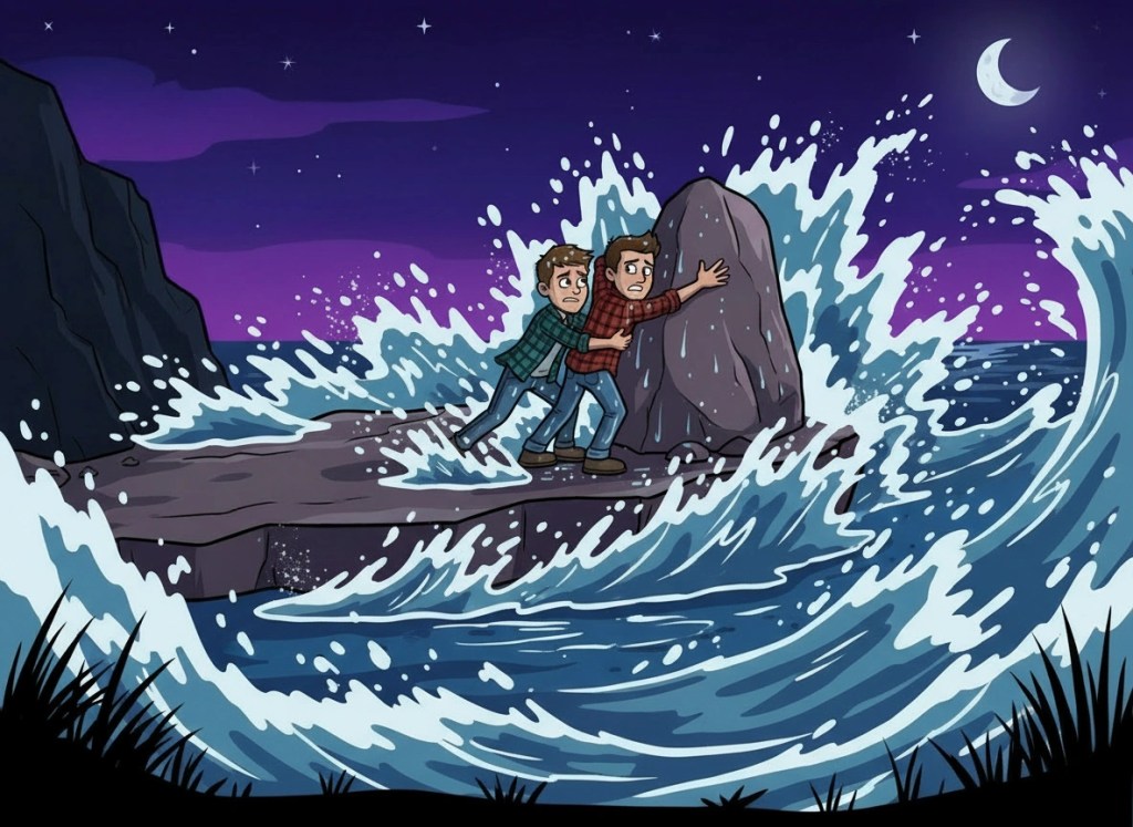 I don’t know how long we were stuck there, but eventually the waves backed off, and we made a mad dash for the beach. As we reached the sand, we could see a few figures walking towards us. Some of the guys had noticed us missing and had set off to find us.